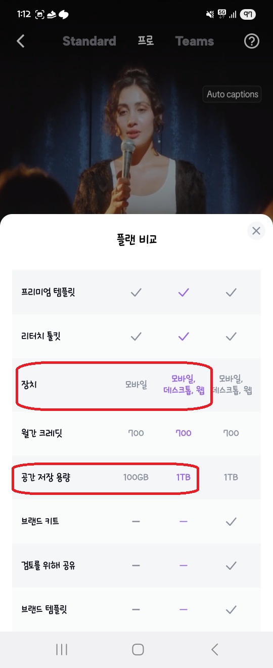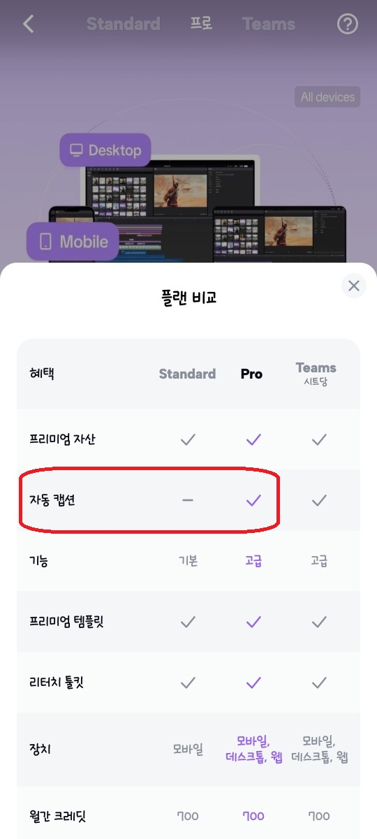 반면, 프로 요금제는 쇼츠·릴스·틱톡 등으로 수익화를 노리는 크리에이터에게 더 잘 맞는 구성입니다. 특히 가장 큰 차이는 자동 캡션(AI 자막) 기능입니다. 스탠다드는 자막을 직접 하나씩 입력해야 하지만, 프로는 음성을 자동으로 인식해 자막을 생성하고, 타이밍과 스타일까지 자동으로 맞춰주기 때문에 자막 작업 시간을 크게 줄일 수 있습니다.