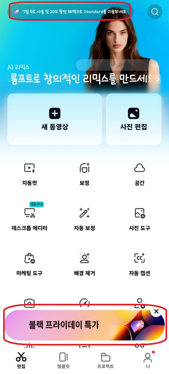 캡컷 어플로 들어가 로그인한 후 홈 화면에서 블랙 프라이데이 배너를 클릭하면 됩니다.
